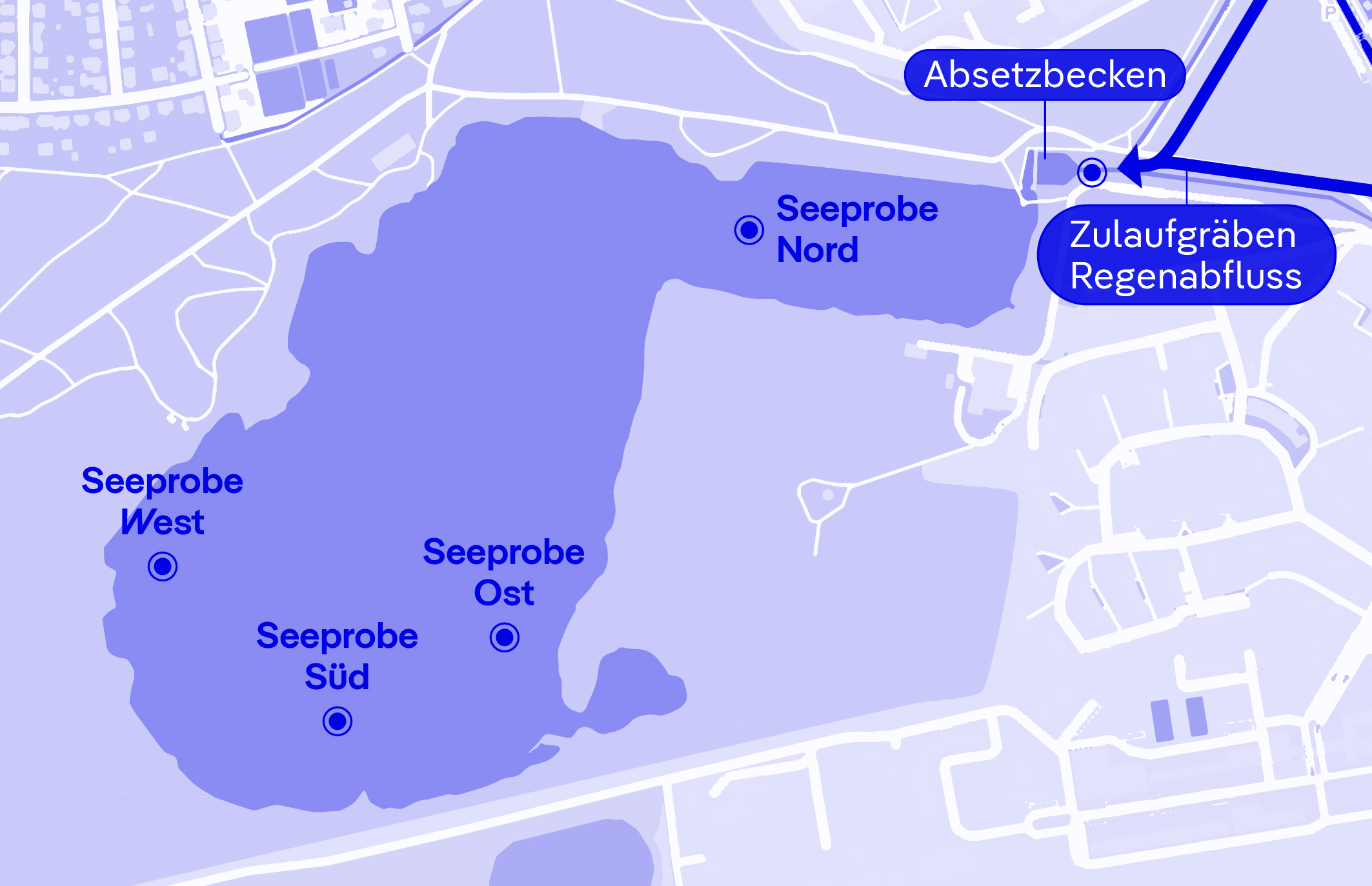 Zur Bewertung der Auswirkungen von Regenwassereinleitungen auf einen urbanen See wurden Proben aus dem Flughafensee entnommen. Dieser See befindet sich nahe einer Altlast, die durch den langjährigen Betrieb des Flughafens Tegel entstanden ist. Zudem erhält der See Einleitungen von Regenabfluss aus einem Einzugsgebiet, das das zuvor untersuchte Industriegebiet einschließt. Die Ergebnisse wiesen neun PFAS-Verbindungen nach und zeigten, dass die PFAS-Konzentrationen im See sogar etwa zehnmal höher waren als im Regenabfluss. Dies könnte entweder auf eine langfristige Akkumulation von Regenwassereinträgen oder auf eine Kontamination durch belastete Grundwasserströme zurückzuführen sein. Um diese Hypothesen weiter zu untersuchen, wurden Proben aus nahe gelegenen Grundwassermessstellen und Seesedimenten genommen.