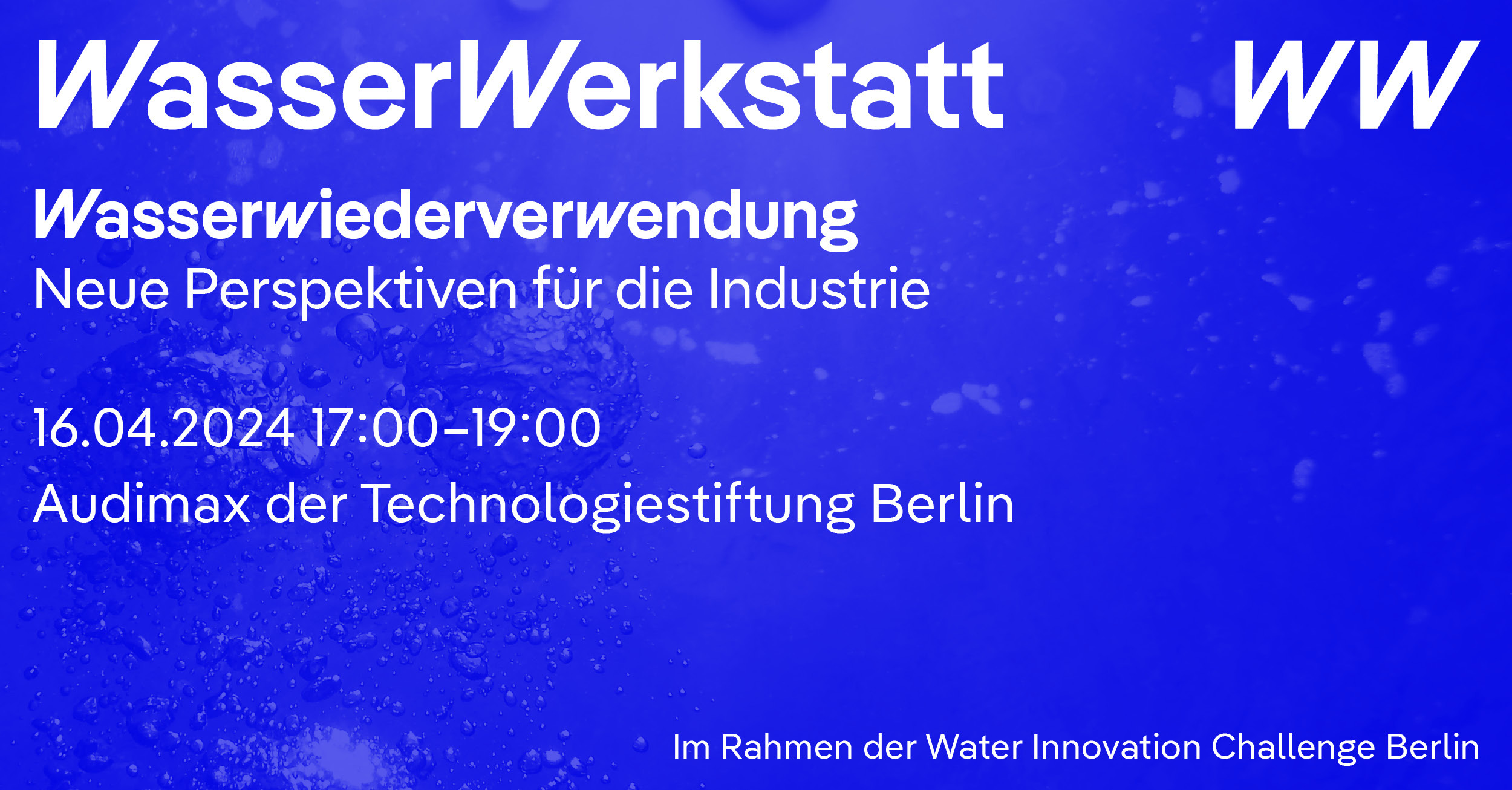 Die WasserWerkstatt findet im Rahmen der „Water Innovation Challenge Berlin“ statt. Diese wird organisiert von der Hochschule für Wirtschaft und Recht Berlin in Zusammenarbeit mit dem Startup Incubator Berlin, der IHK Berlin, dem Hochschulnetzwerk Zukunft findet Stadt und Berlin Partner für Wirtschaft und Technologie. Die Water Innovation Challenge bringt Wirtschaft, Forschung und Gesellschaft zusammen, um sich den größten Herausforderungen unserer Zeit und unserer Stadt in konkreten Kooperations- und Transferformaten zu stellen.