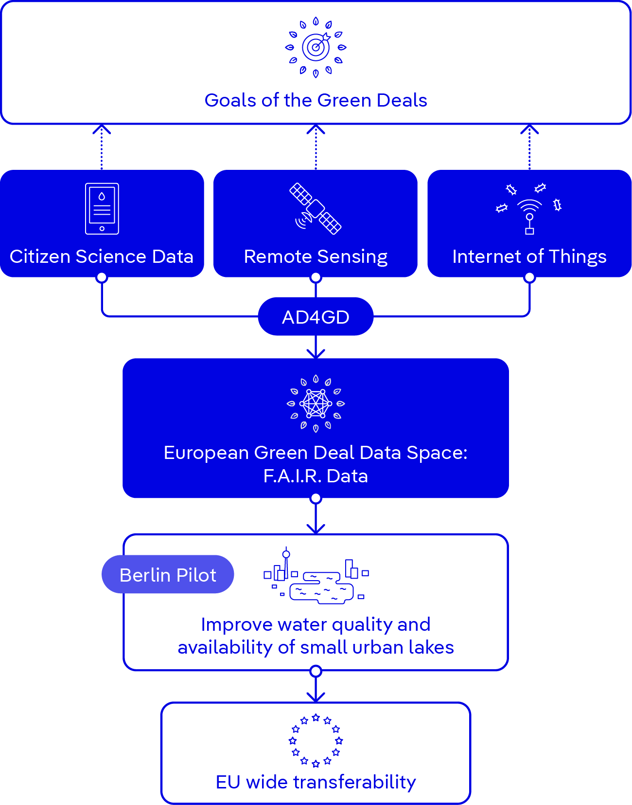 The AD4GD project will design a pan-European data space (Green Deal Data Space - GDDS) in which the different data types as well as data processing services will be available according to the FAIR principle. The focus is on interoperability concepts which bridge the semantic and technological gaps.