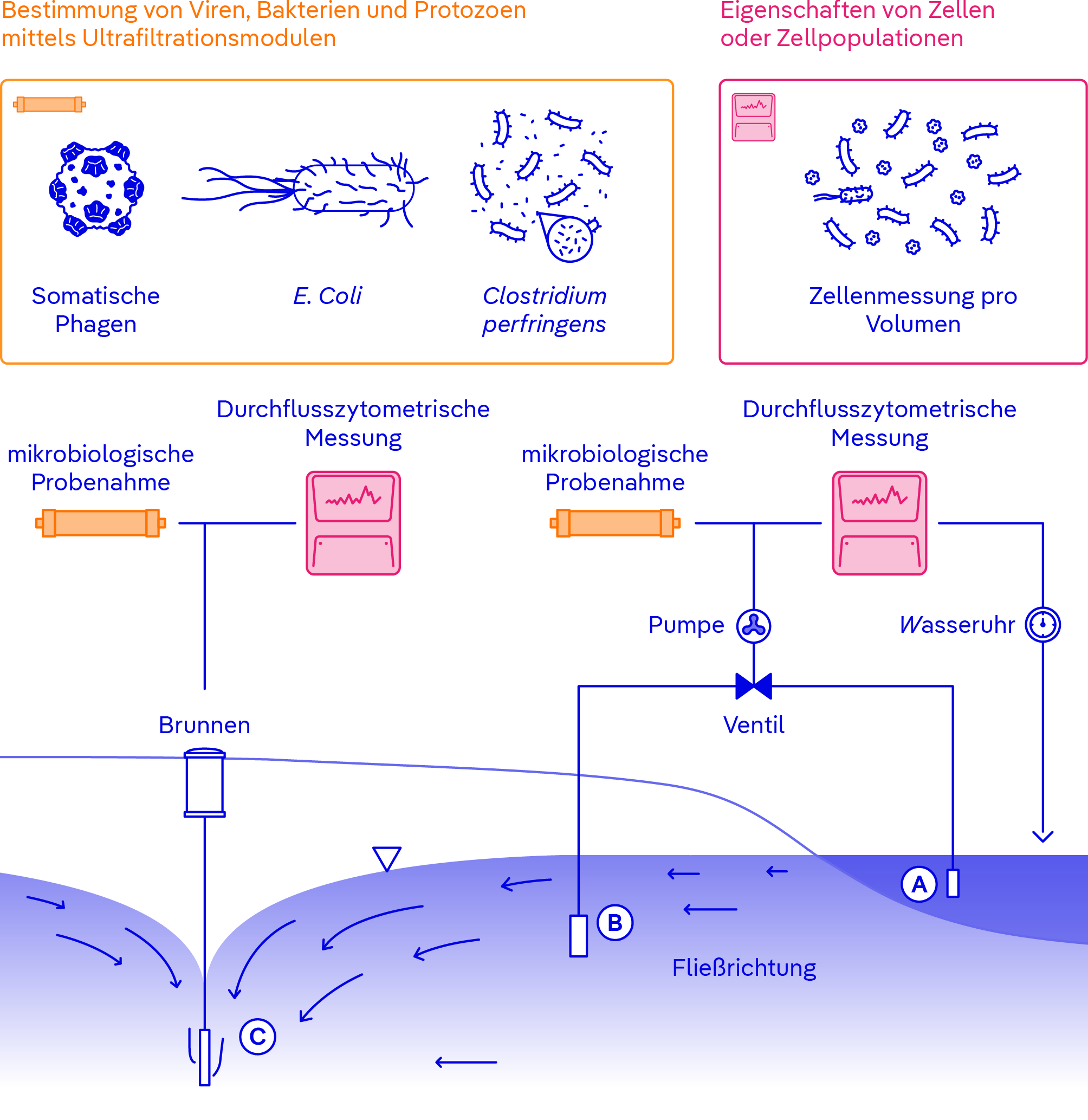 Schematische Darstellung der Messung und Probenahme im Gelände. Vor-Ort-Messungen mit einer Durchflusszytometrie und Probenahme mittels Ultrafiltrationsmodulen